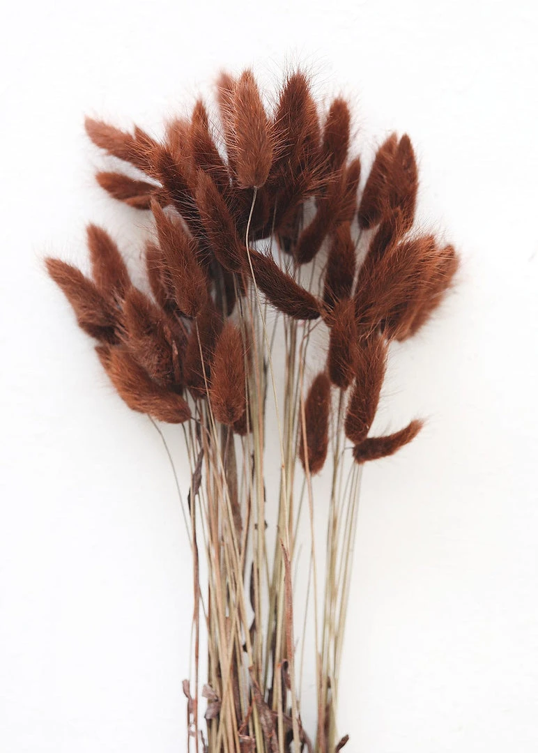 Trendy vase styling calls for nature’s natural beauties. Simply add this chocolate and walnut brown dried Lagurus bunny tail grass to a bud vase for an elevated neutral look.