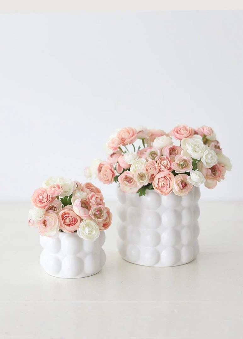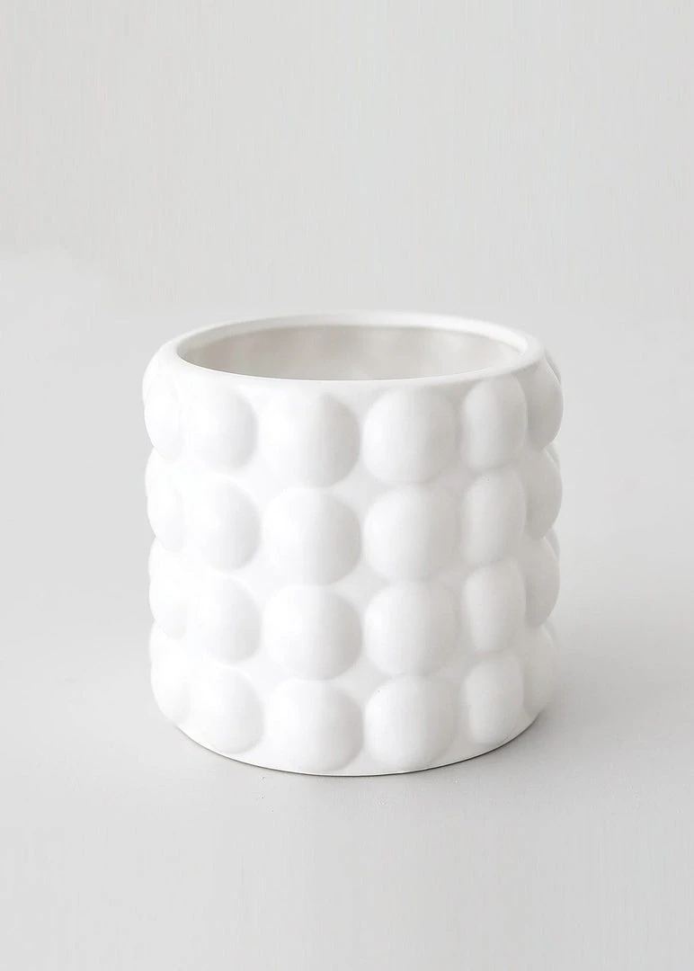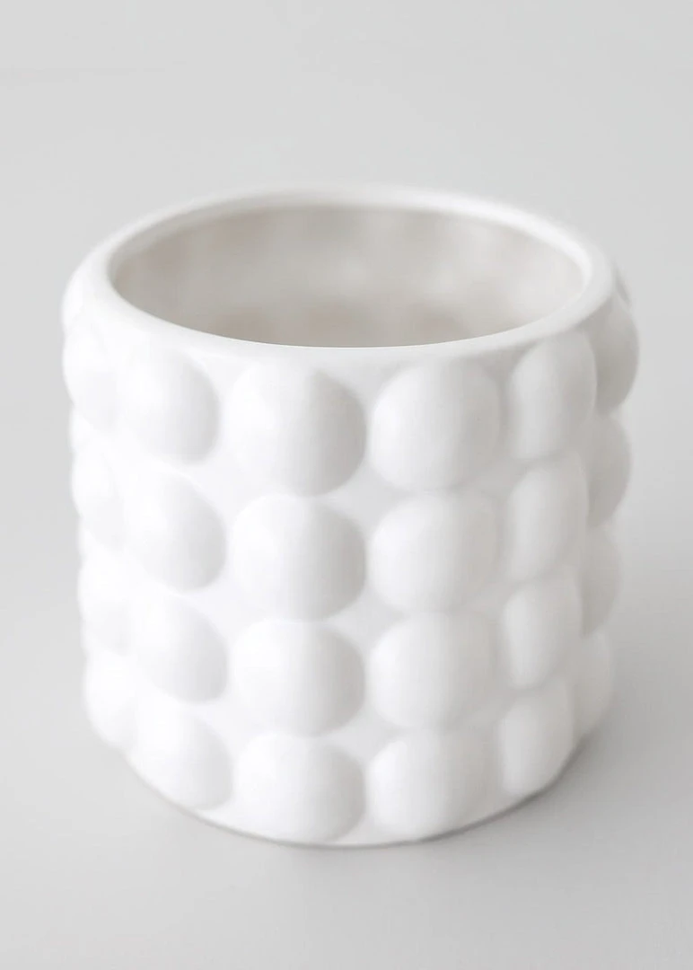 Elevate your decor with unique planters like this matte white ceramic textured pot from the Bubble Collection. The large hobnail knobs add character, making this pot a chic home for your plant. NOT Frost Proof, store inside during winter months.