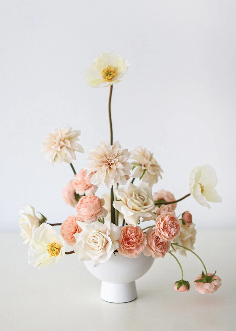 This large ceramic compote bowl in white is the perfect vessel for your classic wedding centerpieces. Any artificial flower arrangement is going to look stunning in this clean, simple, and sophisticated vase.