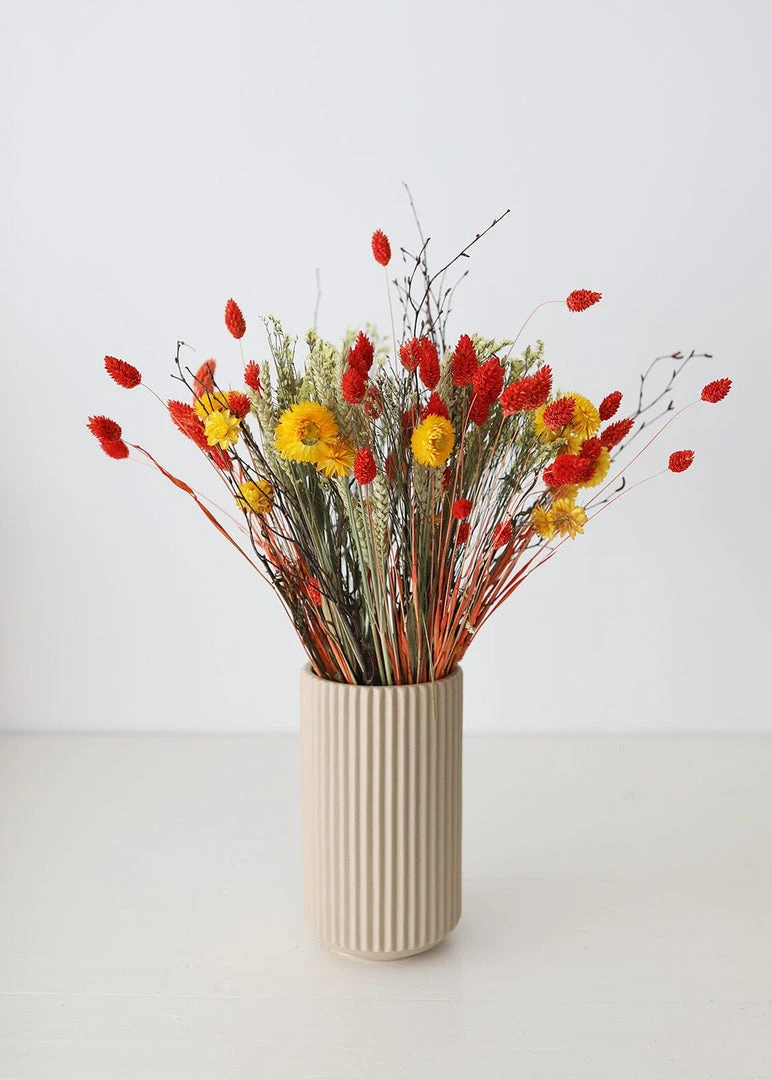 Invite nature’s beauty into your home with this striking, bright orange and yellow floral bouquet of colorful dried botanicals. Featuring everlasting daisies, phalaris grass, triticum wheat, and oats, the natural flowers in this hand-arranged bouquet were grown, dried, and dyed with eco-friendly, water-based dyes on a sustainable flower farm in the Netherlands.