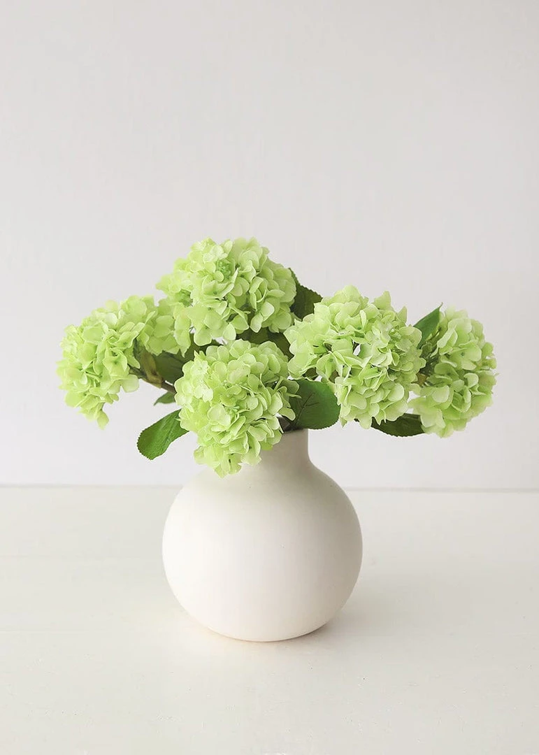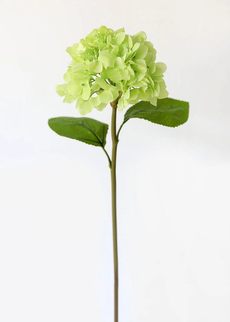 These faux hydrangea blooms feel as real as they look, featuring natural-touch petals. Their coloring offers lively hints of lime and subtle yellow tones, reminiscent of young hydrangea blooms in springtime.