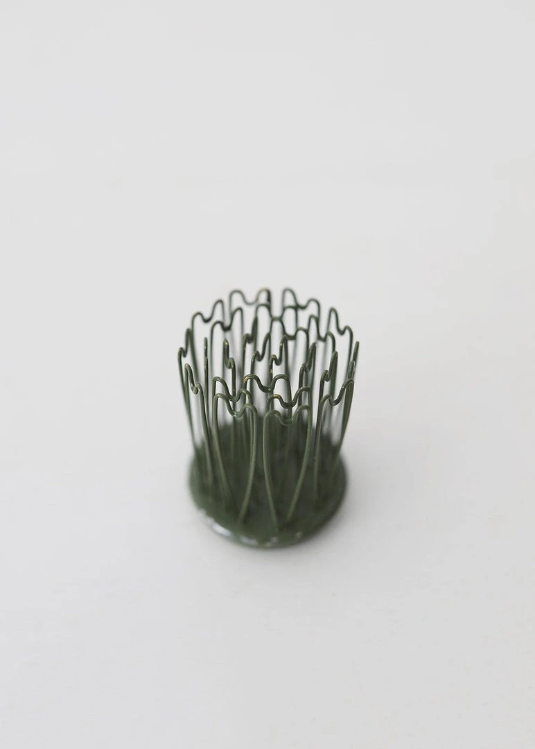 This heirloom floral arranging tool allows you to simply create flower arrangements without a fuss and with no foam. This round hairpin flower frog holder in green has a heavy base and the brass looped pins are bendable and make it easy for you to design from any angle. A lifetime reusable floral tool that will be passed down through the generations of floral admirers in your family. Can be used with fresh and fake flowers. This floral frog hairpin is handcrafted and sturdy to be reused through the generations.