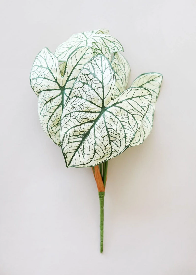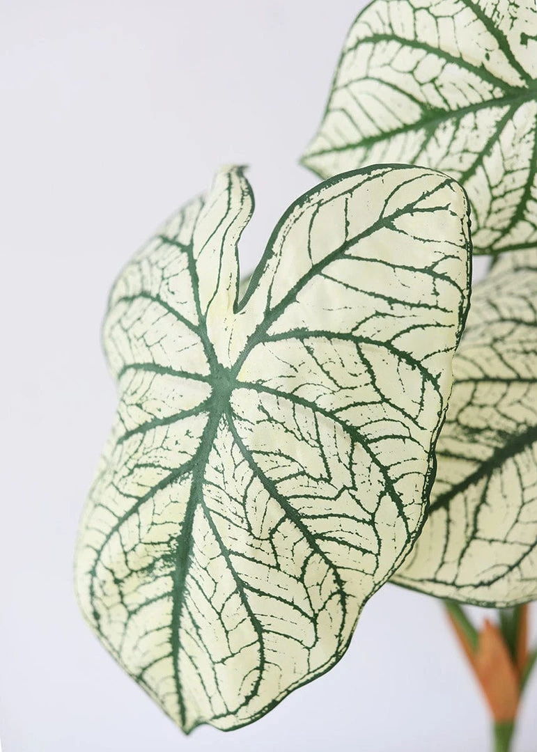 Bring the tropics into your home with this variegated tropical Caladium plant. These cream green and green variegated silk leaves offer an oversized elephant ear shape, and a smooth green wired stem to easily give shape and dimension to your faux plant.Â